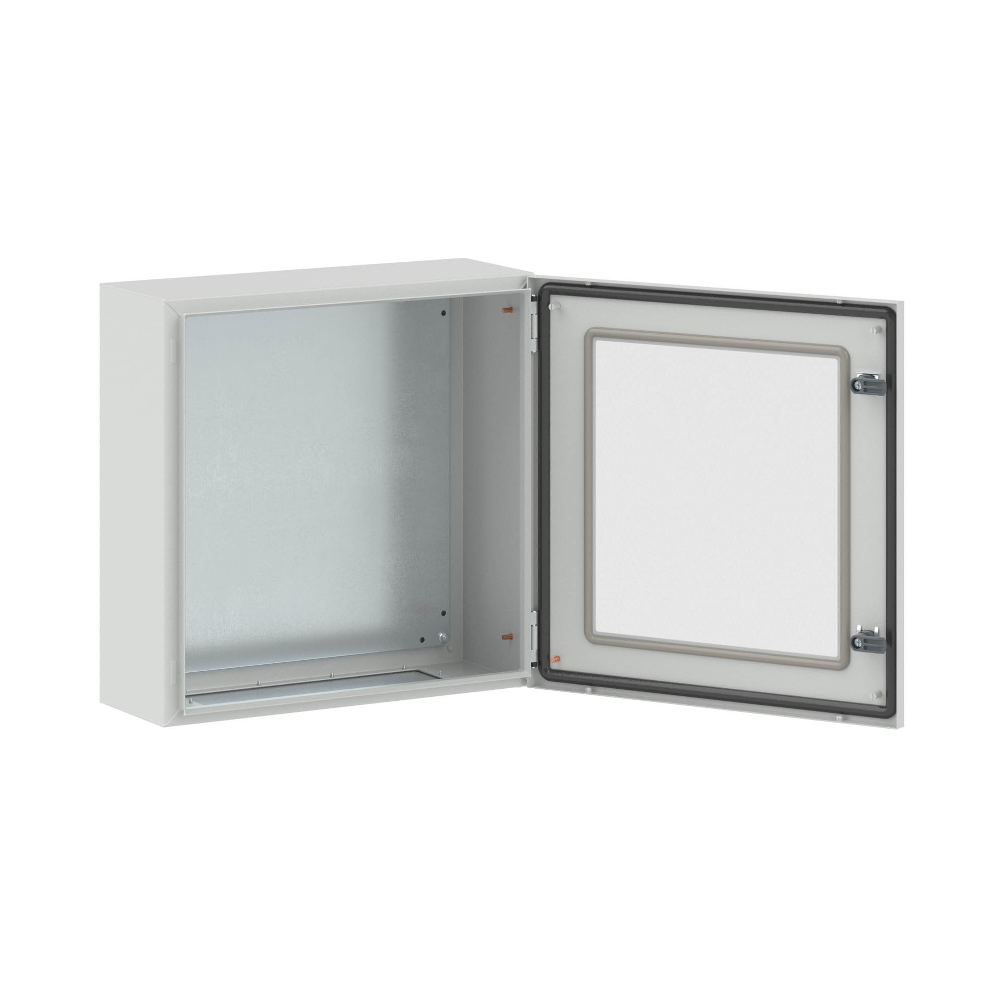 "RAM block" – система универсальных металлических корпусов – сварных и сборных, а также стоек управления. Сборные металлические шкафы СE предназначены для защиты от внешнего воздействия оборудования в системах автоматизации и распределения электроэнергии. Корпуса CE имеют всего 4 сварных шва, что повышает прочность конструкции. Корпуса изготавливаются из листовой стали толщиной 1,5 мм с порошковой полиэфирной окраской. Полиуретановый уплотнитель улучшает герметизацию (максимальная степень пыле- и влагозащиты - IP 65 - IP 66). В комплект поставки корпусов входят: фланец, монтажные аксессуары, монтажная плата. По умолчанию шкафы укомплектованы стандартным замком с личинкой под ключ с двойной бородкой, однако замок при необходимости может быть заменен. Сборные металлические шкафы CE соответствуют российским стандартам, они могут устанавливаться в сейсмоопасных зонах и имеют необходимые сертификаты. Корпуса с прозрачной дверью чаще всего используются в системах мониторинга, защиты и автоматизации. Уровень ударопрочности корпусов - IK 10. Закаленное стекло устойчиво к повреждениям. Габариты навесного шкафа: 500х500х200 мм.